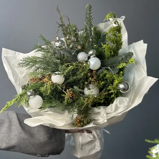 Мягкие переливы зелени, переплетение хвойных ветвей и мерцание декора передают ощущение зимней сказки. Тонкий аромат леса, глубина оттенков и фактурность композиции напоминают о прогулке по заснеженному лесу – тепло и гармония в каждом элементе.
