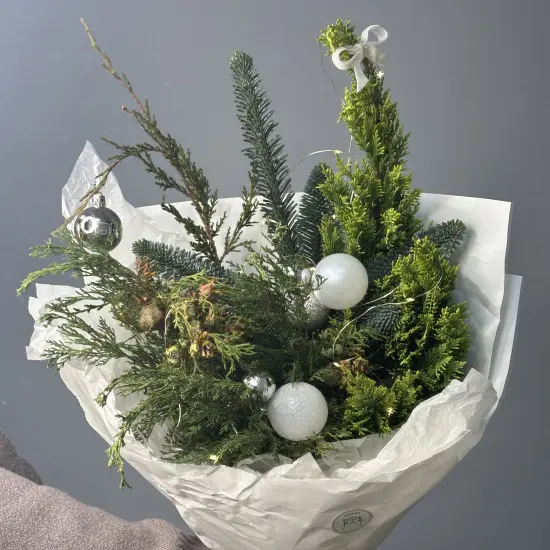 Зеленые оттенки хвои переплетаются с мягким мерцанием декора, напоминая о зимнем лесе, заснеженных ветвях и домашнем тепле. Композиция дышит естественной красотой – без излишней вычурности, но с тонким чувством гармонии.