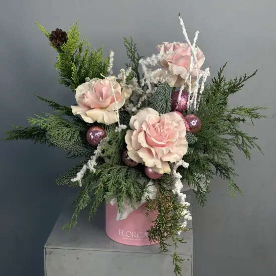 Зимняя композиция в шляпной коробке: натуральные еловые веточки, крупные сортовые розы, кудрявые гвоздики и уютные новогодние шарикиРазмер композиции - около 30 см