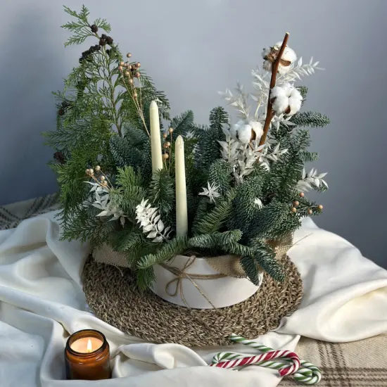Мягкие оттенки зелени и теплые тона сухоцветов напоминают о зимнем вечере у камина. Еловые ветви добавляют лесной свежести, а мерцание свечей усиливает ощущение домашнего уюта. Композиция передает спокойствие и гармонию – как будто часть зимнего пейзажа перенесена в интерьер.