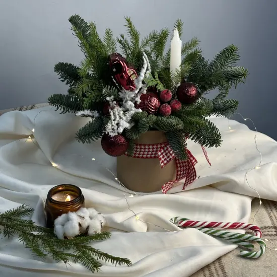 Глубокая винная палитра переплетается с мягкими текстурами, создавая атмосферу уютного зимнего вечера. Игрушка добавляет ностальгические нотки, напоминая о детских праздниках и тепле домашнего очага. Композиция выглядит одновременно элегантно и по-домашнему уютно – как будто часть зимней сказки.