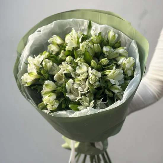 Белые лепестки с едва заметными прожинками создают ощущение легкости и чистоты. Альстромерии раскрываются постепенно – букет сохраняет форму и объем, наполняя пространство тонким свежим ароматом. Строгие линии стеблей и нежные изгибы бутонов образуют гармоничный баланс между элегантностью и естественностью.