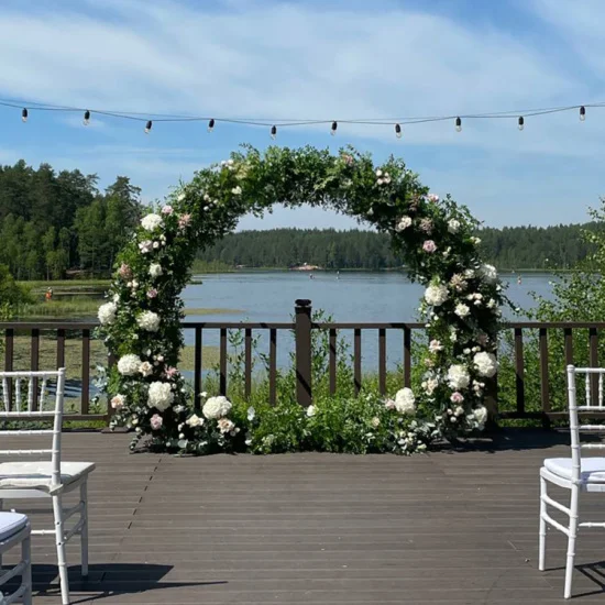 Декор круглой арки - море свежей зелени, упругие белые гортензии, астильба, фрезия, крупные сортовые розы, веточки лимониума и нежные кустовые розочкиРазмеры арки - 2*2,4м 35150