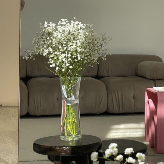 Белые соцветия, напоминающие облако, придают пространству ощущение свежести и простора. Минималистичная эстетика букета – без лишних деталей, но с выразительной текстурой – гармонично вписывается в современные интерьеры, добавляя им лёгкость и естественность.
