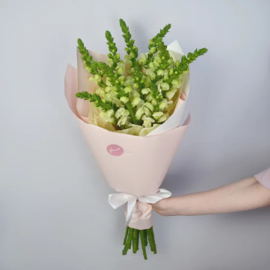 Стойкий букет из 11 белых антирринумов в нежной упаковке - необычный и запоминающийся подарок. Неприхотливые в уходе, антирринумы становятся изящным украшением, а нежный бело-зеленый оттенок цветов напоминает о лете, тепле и свежести.Размер букета из 11 белых антирринумов - около 40 см