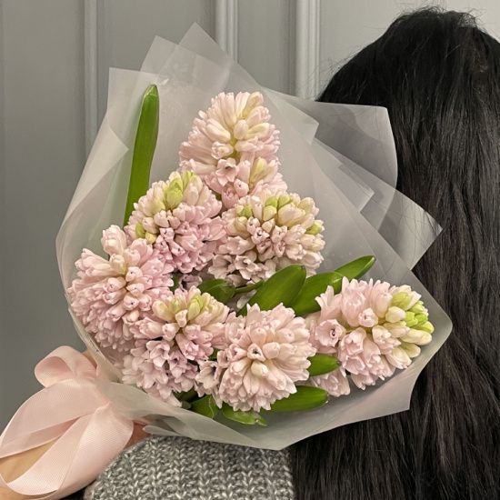 Размер букета из 7 гиацинтов, украшенных стильной упаковкой - около 25 см 2500