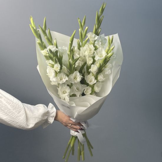 Белые гладиолусы с их удлинёнными линиями и благородной формой создают ощущение чистоты и лёгкости. Сочетание свежести зелени и холодного оттенка лепестков напоминает о первых лучах солнца на снегу – одновременно нежно и торжественно.
