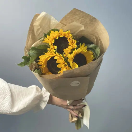 Солнечный букет из 3 крупных сезонных подсолнухов в стильной крафт-бумаге.Размер букета подсолнухов - около 30-35 см