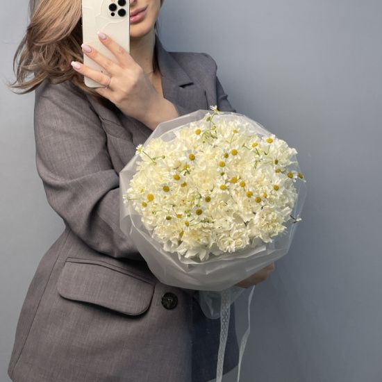 Стройные стебли гвоздик переплетаются с воздушными соцветиями матрикарии, создавая ощущение легкости и гармонии. Пастельные оттенки – от кремового до нежно-розового – добавляют композиции утонченности, напоминая о первых летних рассветах. Букет выглядит одновременно лаконично и празднично, сохраняя баланс между элегантностью и непринужденностью.