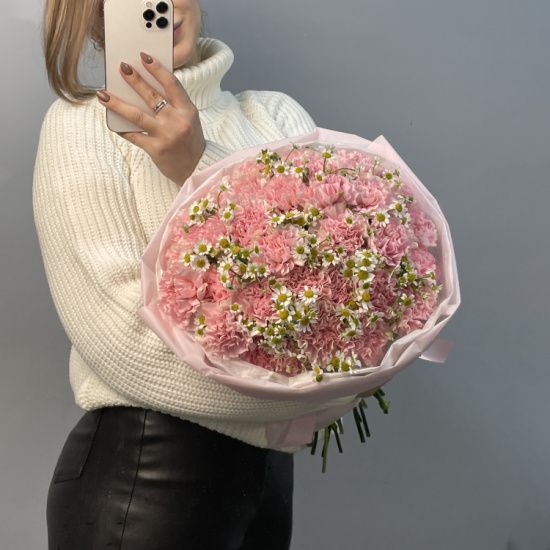 Розовый дуо-букет гвоздик и матрикарий L