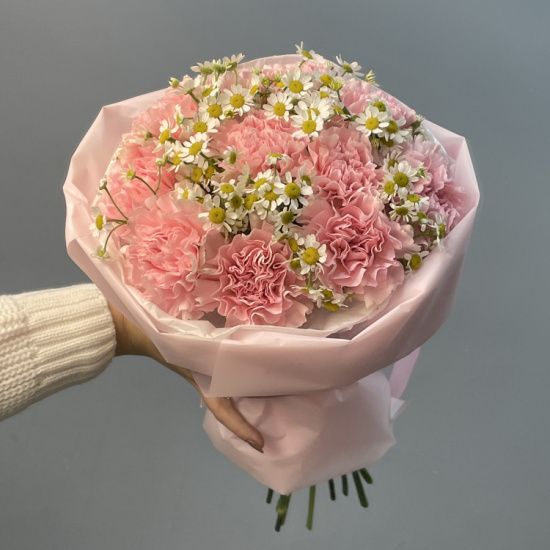 Легкие лепестки гвоздик переплетаются с игривыми соцветиями матрикарии, создавая ощущение невесомости. Пастельные оттенки и мягкие линии придают букету утонченность, напоминая о первых летних днях – свежих, светлых, наполненных теплом.