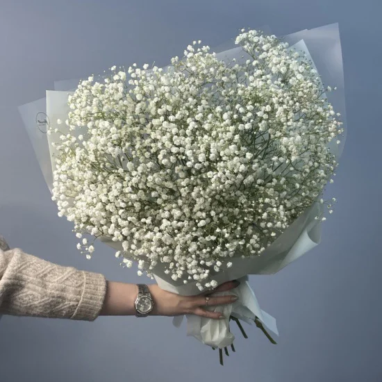 Пышный букет из 9 веточек душистой гипсофилы белого оттенка, украшенных стильной упаковкой, поднимет настроение и приятно удивит.Гипсофила - стойкий и пышный цветок, на веточке которого множество маленьких шариков-соцветий, имеющих приятный медовый аромат.