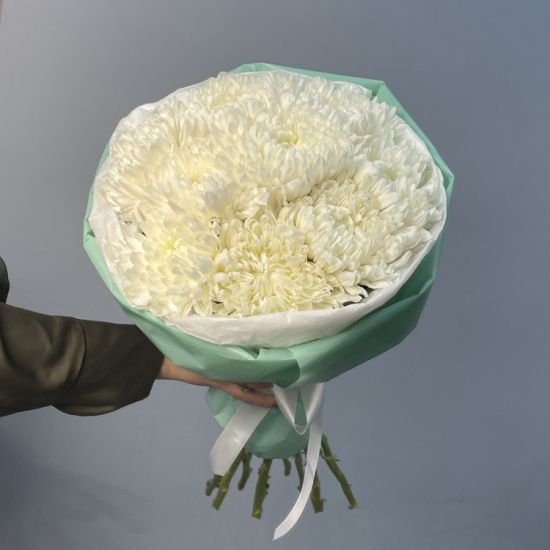 Свежий белый оттенок лепестков в сочетании с мягкими зелеными акцентами создает ощущение легкости и чистоты. Хризантемы с их округлыми формами и плотной структурой выглядят одновременно элегантно и современно – строгость линий компенсируется нежностью цветовой гаммы.