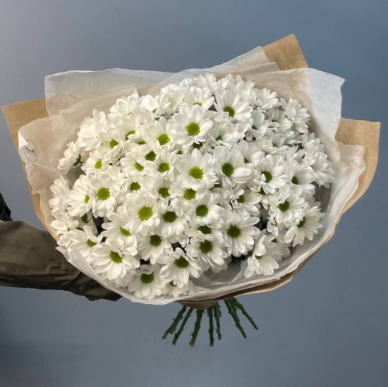 Свежие соцветия хризантем создают ощущение легкости и натуральности – будто только что собранный полевой букет. Молочные и кремовые оттенки лепестков сочетаются с насыщенной зеленью стеблей, придавая композиции естественную гармонию. Простота и стойкость этих цветов делают их идеальным выбором для тех, кто ценит лаконичную красоту.