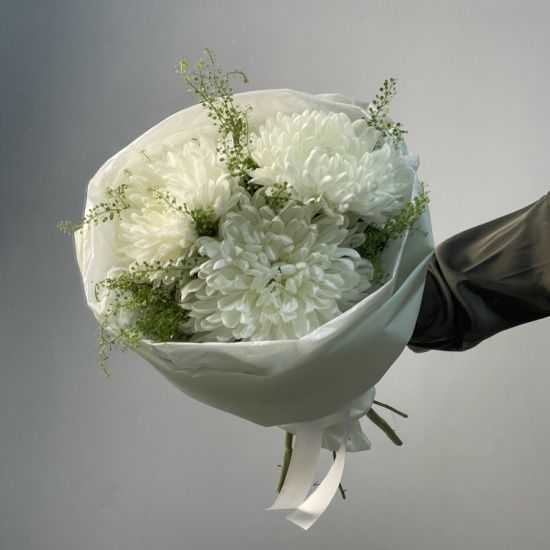 Свежие лепестки образуют пышные шары, напоминающие облака – воздушные, но с выразительной структурой. Зеленоватый центр придает глубину, создавая эффект легкого мерцания. Букет выглядит одновременно сдержанно и празднично, передавая ощущение чистоты и гармонии.