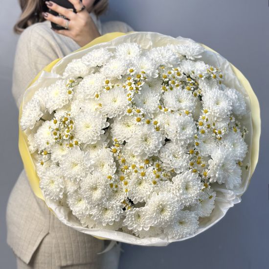 Солнечные ромашки и нежные хризантемы переплетаются в воздушном ритме, напоминая о теплых днях. Свежесть зелени и мягкие оттенки белого передают ощущение беззаботности – будто летний ветерок застыл в изящных линиях.