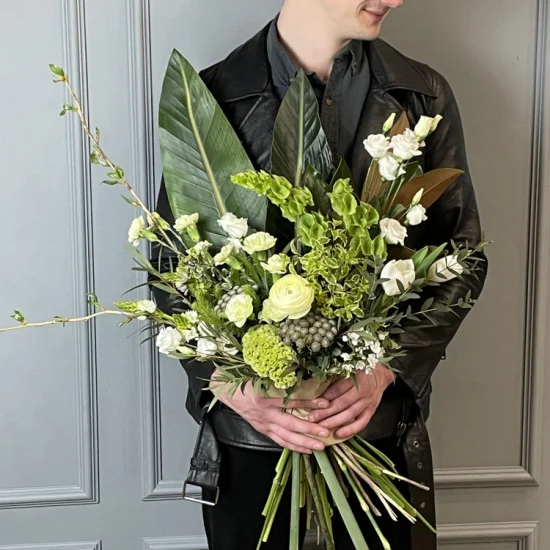 Пышный мужской букет, выполненный в лесном стиле. В составе: молюцелла, кустовая гвоздика, бруния, эустома, аллиум, целозия, орнитогалум, веточки прунуса и море зелени - крупные листья стрелиции, питтоспорум и эвкалипт.Высота мужского букета - около 55-60 см