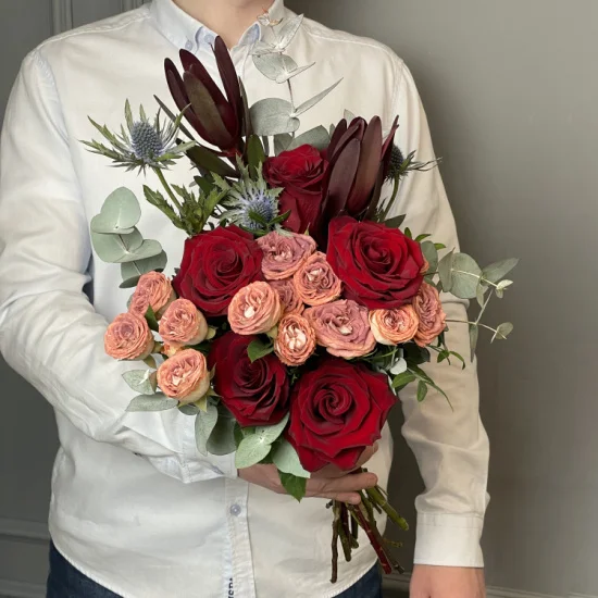 Мужской букет, выполненный в бордовых оттенках с крупными алыми розами, леукодендроном, фактурным эрингиумом и пышной зеленью.Высота мужского букета Red - около 50 см