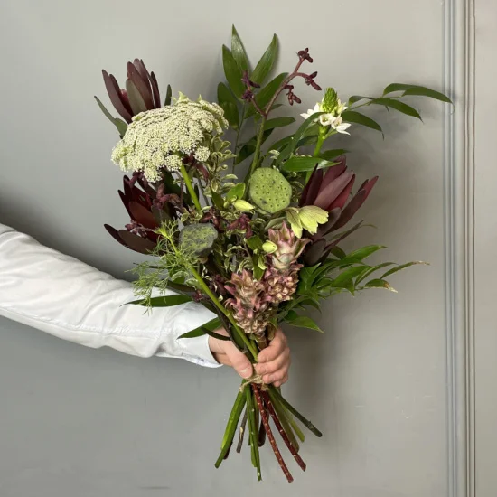 Мужской букет с интересным цветочным составом, собранный из коробочек лотоса, фактурного амми, леукодендрона, анигозантуса, хелеборуса, ананасов и веточек рускуса.Высота мужского букета Тропики - около 50 см