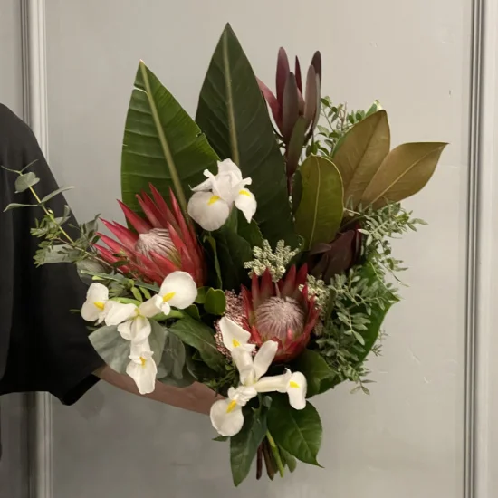 Брутальный мужской букет в бордовых оттенках с протеей, белыми ирисами, леукодендроном, крупными листьями аралии и стрелиции, озотамнусом и вероникой.Размер мужского букета - около 60 см