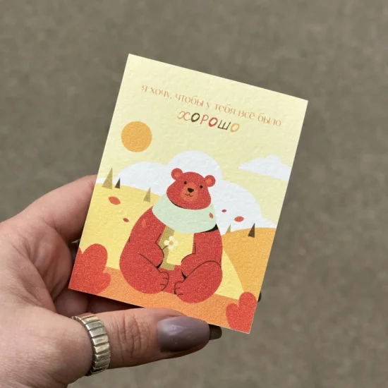 Тонкие линии и плавные переходы цветов передают легкость и светлые мысли, словно теплый ветерок, несущий добрые пожелания. Каждый взгляд на эту открытку напоминает о том, что где-то рядом есть люди, искренне желающие счастья – без громких слов, но с тихой уверенностью, что все сложится именно так, как нужно.