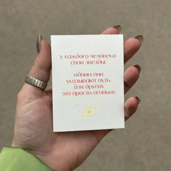 Эта открытка словно приглашает задуматься о мечтах и возможностях, которые ждут впереди. Она передает ощущение вдохновения и веры в собственный путь – как будто каждый может найти свои звезды и следовать за ними. Теплота золотых бликов на темном фоне создает атмосферу уюта и тайны, напоминая, что даже в самых далеких горизонтах есть что-то личное и значимое.