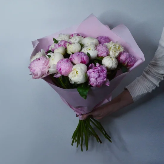 Свободный букет Здесь нет строгих правил и жёсткой упаковки. Всё решает задумка мастера: он может использовать пионы разных оттенков и другие растения. В декоре тоже нет ограничений: пригодится цветная или прозрачная плёнка, искусственная сетка, фетр с рисунком и прочее. Эта композиция сродни экспромту – лёгкая и неожиданная, привлекающая искренностью и простотой.