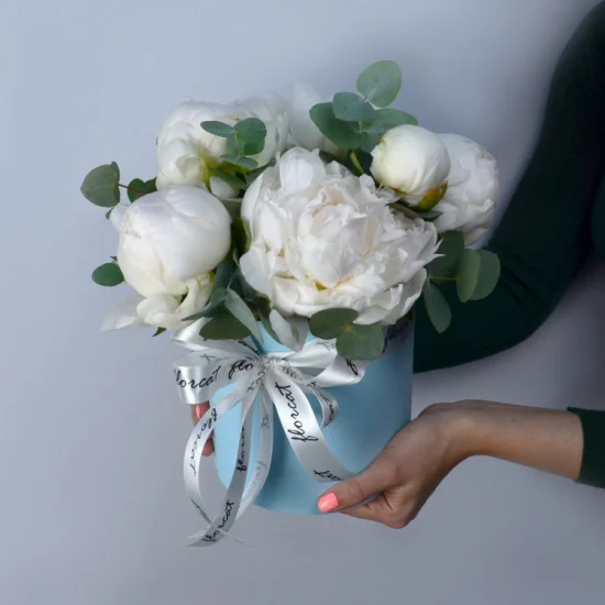 Нежные лепестки пионов, наполненные теплом, раскрываются постепенно, создавая эффект пышного облака. Свежесть белого оттенка подчеркивает чистоту и легкость, а упаковка в коробке добавляет современный лаконичный штрих. Композиция излучает гармонию и утонченность – идеальный выбор для тех, кто ценит эстетику и естественную красоту.