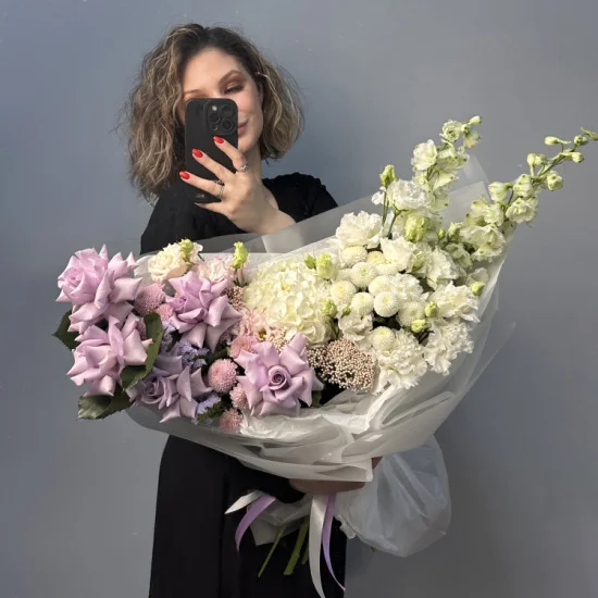 Нежные переливы сиреневого, фиолетового и лавандового создают ощущение воздушности и легкости. Крупные соцветия дельфиниума придают объем, а мелкие детали – статица и эустома – добавляют изысканности. Букет словно впитал в себя мягкий свет заката, передавая спокойствие и умиротворение.