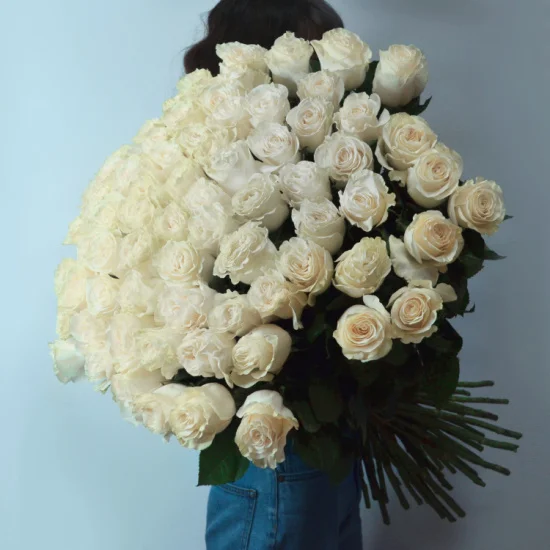 Букет из 101 крупной розы Mondial белого оттенка, привезенной прямиком из солнечного Эквадора, способен украсить любое событие. Плотные бутоны белых роз в раскрытии становятся кремовыми и дарят нежный цветочный аромат.Огромный букет из 101 розы создаст прекрасное настроение, приятно удивит и запомнится надолго!