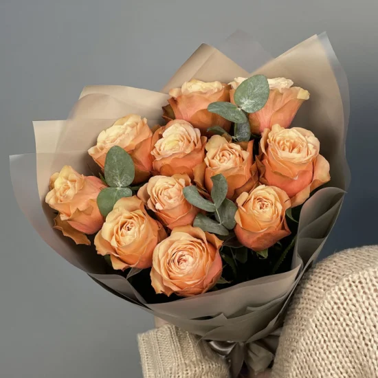 Букет из 11 стойких ароматных роз сорта Kahala с персиковой сердцевиной, украшенных веточками эвкалипта и минималистичной крафтовой упаковкой. Розы сорта Kahala обладают отличной стойкостью, нежным цветочным ароматом и удивительным свойством менять цвет в раскрытии, становясь более светлыми и нежными. Размер букета из 11 роз Kahala - около 30-40 см 8200