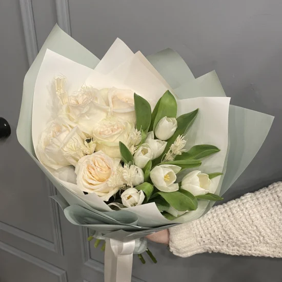 Свежесть белоснежных лепестков, мягкие переходы оттенков и воздушность зелени создают ощущение легкости и чистоты. Розы с тонким ароматом, хрупкие тюльпаны и кружево нигеллы складываются в гармоничный ансамбль – будто утренний свет, застывший в цветах.