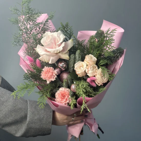 Стойкий зимний букет с новогодним настроением из пионовидных роз, гвоздик, натуральных веточек нобилиса и новогодних шариковРазмер букета - около 35 см