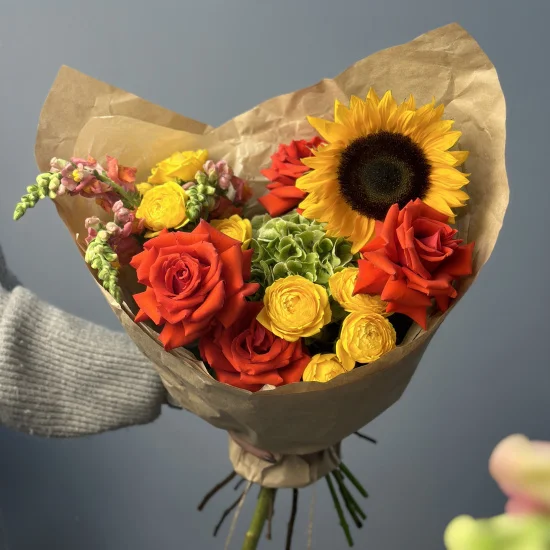 Осеннее солнце — очаровательный сборный букет с ярким подсолнухом, сортовыми пионовидными розами, садовым антирринумом и осеннней гортензией.Размер сборного букета Осеннее солнце - около 45-50 см