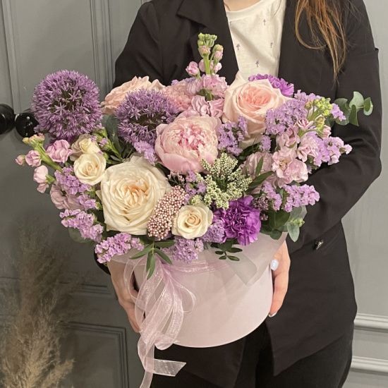 Букет в шляпной коробке Нежный лавандовый