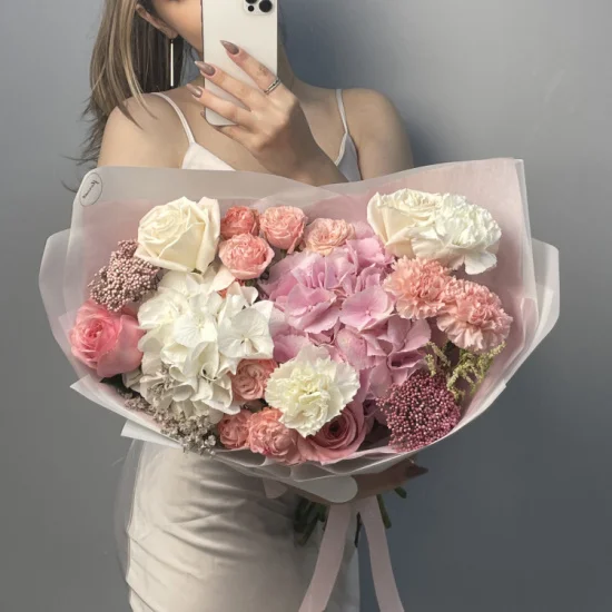 Сборный букет Панна Котта из премиум-раздела, собранный из крупных сезонных гортензий, пионовидных роз, фактурного ваксфлауэра, веточек астильбы и озотамнуса, напоминает сладкий итальянский десерт из сливок с ягодным джемом.Объемный сборный букет, выполненный в бело-розовой цветовой гамме, подарит чудесное настроение.