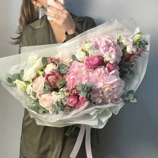 Пышный букет из премиум-раздела, оттенками напоминающий мерцающий жемчуг, собран из крупных кустовых роз, упругих гортензий, пионовидных роз сорта White O'Hara, экзотических протей, эустомы и эвкалипта.Объемный сборный букет поможет передать ваши трепетные и нежные чувства.