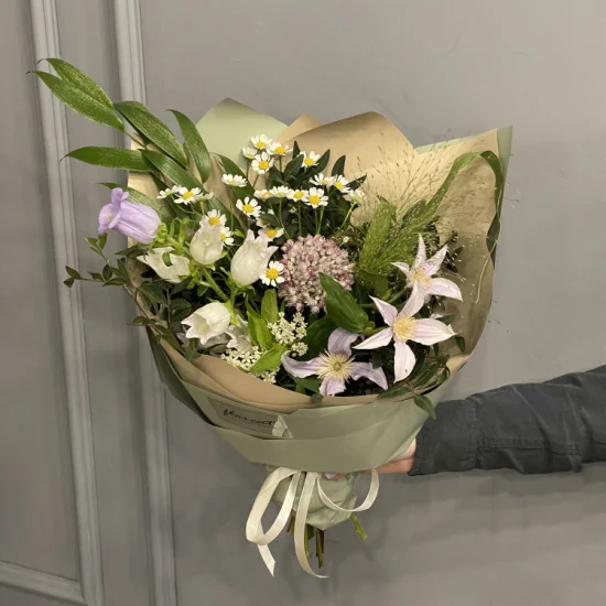 Полевой — сборный букет, собранный из воздушных матрикарий, колокольчиков клематиса, сезонной кампанулы, аллиума и зелени в полевом стиле.Размер сборного букета Полевой S - около 30-35 см