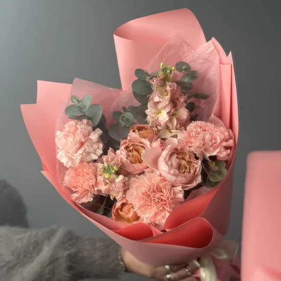 Сборный букет Розовый комплимент, выполненный в оттенках розового, создаст нежное весеннее настроение на весь день. В составе сборного букета сошлись нежные кустовые розы с пионовидным раскрытием, веточки эвкалипта, россыпь гвоздик и ароматная маттиола.Размер сборного букета - около 30 см
