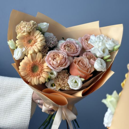 Солнечные герберы переплетаются с воздушными розами, создавая игру света и тени. Гвоздики добавляют текстуру, а эустома – деликатную изысканность. Композиция словно наполнена теплом летнего дня – свежая, яркая, но без излишней пестроты.