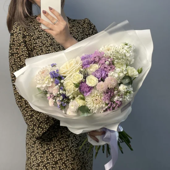 Лиловый — нежный сборный букет в сиреневых тонах. В составе сборного букета сошлись крупные белые розы, сезонные георгины, медовая маттиола, гипсофила, шарики гвоздик, кустовые хризантемы, фактурная статица и кустовая роза. Букет доступен в трех размерах: S, M и L.Размер сборного букета Лиловый L - около 50-55 см