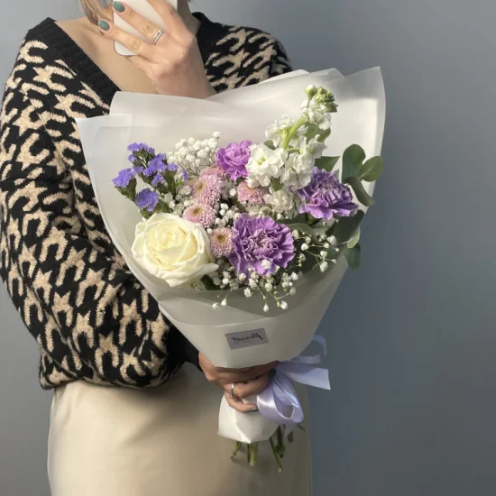 Лиловый — нежный сборный букет в сиреневых тонах. В составе сборного букета сошлись сортовые розы, медовая маттиола, статица, шарики гвоздик и гипсофила. Букет доступен в трех размерах: S, M и L.Размер сборного букета Лиловый S - около 30 см