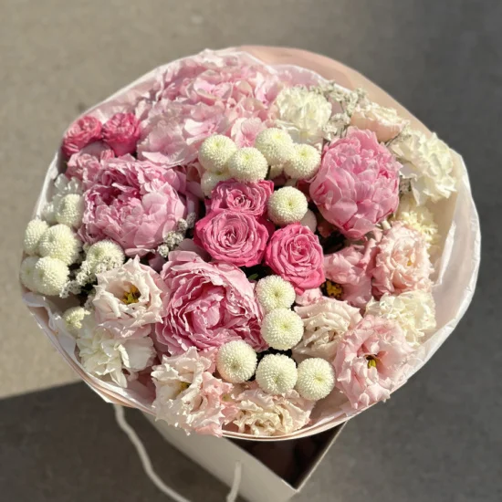 Мягкие переливы розовых и кремовых оттенков создают ощущение воздушности и легкости. Пионы и розы придают объем, а нежные вкрапления эустомы и лимониума добавляют изящества. Композиция напоминает десерт – сладкий, но не приторный, с тонким балансом фактур и полутонов.