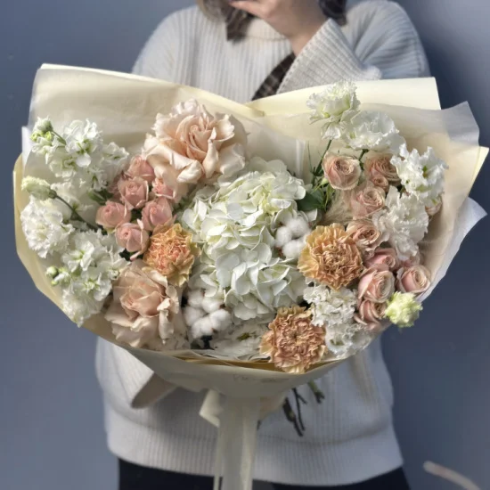 Каждый букет собирается вручную с учетом доступных цветов, но неизменно сохраняет задуманную гармонию. Оттенки и размеры могут варьироваться в зависимости от сезона, но флористы тщательно подбирают материалы, чтобы композиция оставалась выразительной и стильной.
