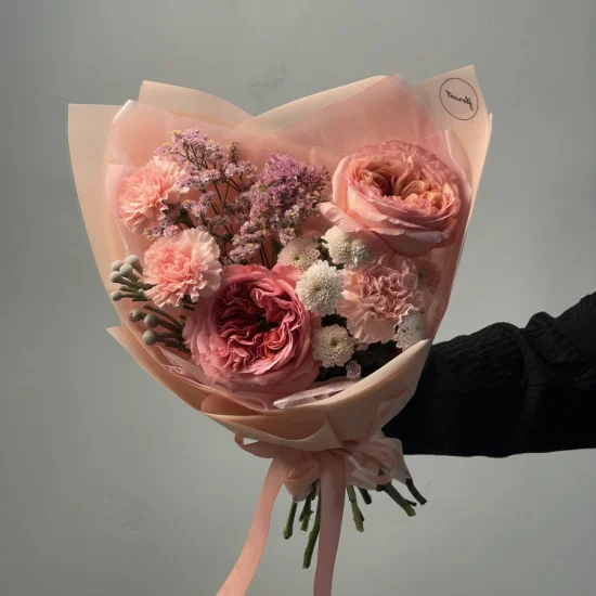 Сборный букет собран из крупных пионовидных роз, стойкого садового седума, нежных гвоздик, шариков сантини и брунии.Размер сборного букета - около 30 см