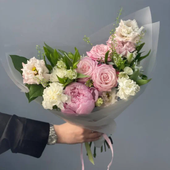 Свежесть розовых и кремовых оттенков, переплетение фактур и легкий аромат напоминают о летнем саде после дождя. Пионы придают пышность, эустома – воздушность, а альстромерии добавляют графичности. Композиция выглядит естественно и непринужденно – будто только что сорвана с клумбы, сохраняя при этом элегантность.