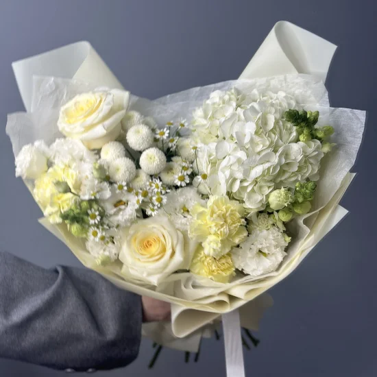 Каждая композиция собирается вручную с учетом доступных цветов – оттенки и пропорции могут незначительно отличаться, но стиль и качество остаются неизменными. Флористы тщательно подбирают материалы, сохраняя задуманную эстетику и свежесть букета.