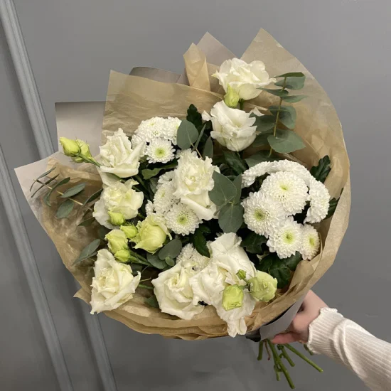 Лёгкость и чистота линий создают ощущение свежести – будто утренний туман, сотканный из лепестков. Белые оттенки переливаются полутонами, а фактура хризантем добавляет объём и мягкость. Композиция словно парит в воздухе, сохраняя баланс между элегантностью и естественностью.
