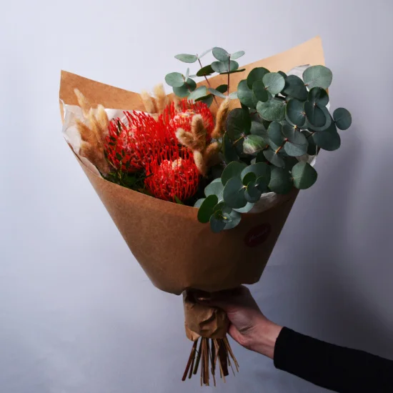 Экзотический сборный букет со стойким составом: нутаном, веточками эвкалипта и лугурусом. Букет, обладающий удивительной стойкостью, упакован в стильную крафтовую бумагу.Размер стойкого сборного букета с нутаном - около 40-50 см 4950