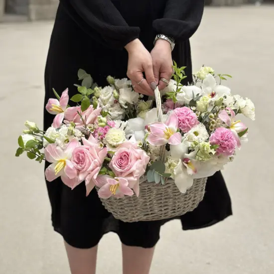 Состав может варьироваться в зависимости от сезонной доступности цветов, но неизменными остаются тщательно подобранная палитра, гармоничные пропорции и безупречное качество материалов. Каждая корзина собирается вручную с сохранением задуманной эстетики и эмоциональной выразительности.